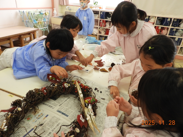 飾りには、どんぐりや、まつぼっくり、きれいな落ち葉も