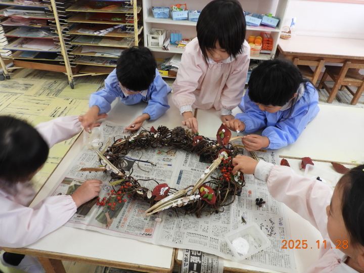 さつまいものつるで大きなリースを作りました。