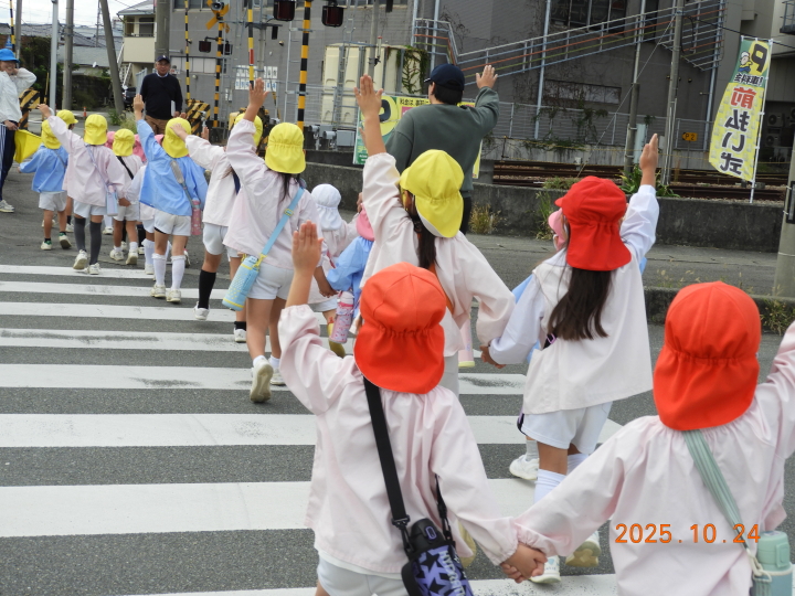 横断歩道ではしっかり手を挙げてわたりました。