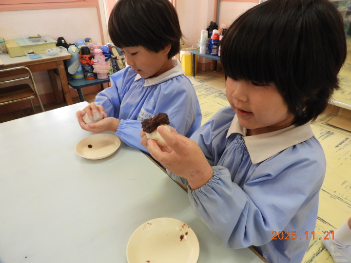 年長さんは、自分でお餅を丸めました。おいしかった!阿南聖母幼稚園大運動会(10月)